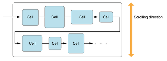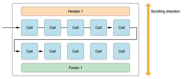 你可以在集合视图中使用具体的布局对象,UICollectionViewFlowLayout类,来排列项目。流布局实现一个基于行断的布局,这意味着布局对象放置单元格到一个线性路径并尽可能沿着那条线放置多个单元格。当布局对象运行超出当前行的空间,它创建新的行并继续在新行进行布局处理。下图显示一个垂直滚动的流布局的样子。在这种情况下,所有行分别水平的 — 新行在之前行的下面。单元格是单独的部分,可以被节页眉和页脚视图包围。