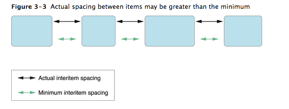 在布局过程中,流布局对象添加项目到当前行直到剩下的空间不足以放下整个项目。如果这排刚好足够大放下整数个项目并且没有额外的空间,那么项目间的间隔等于最小间隔。如果有额外的空间,布局对象增大项目间的间隔直到排的边界。如下图: