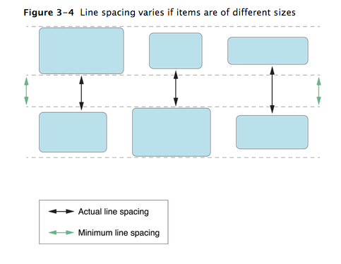 如果你想为你的单元格指定不同的尺寸,你必须实现collectionView:layout:sizeForItemAtIndexPath:方法。你可以使用提供的索引路径来返回对应项目的尺寸。在布局过程中,布局对象使在垂直方向上的项目的中心点在同一条线上。如下图,行的高度或宽度由该方向上最大的项目决定。